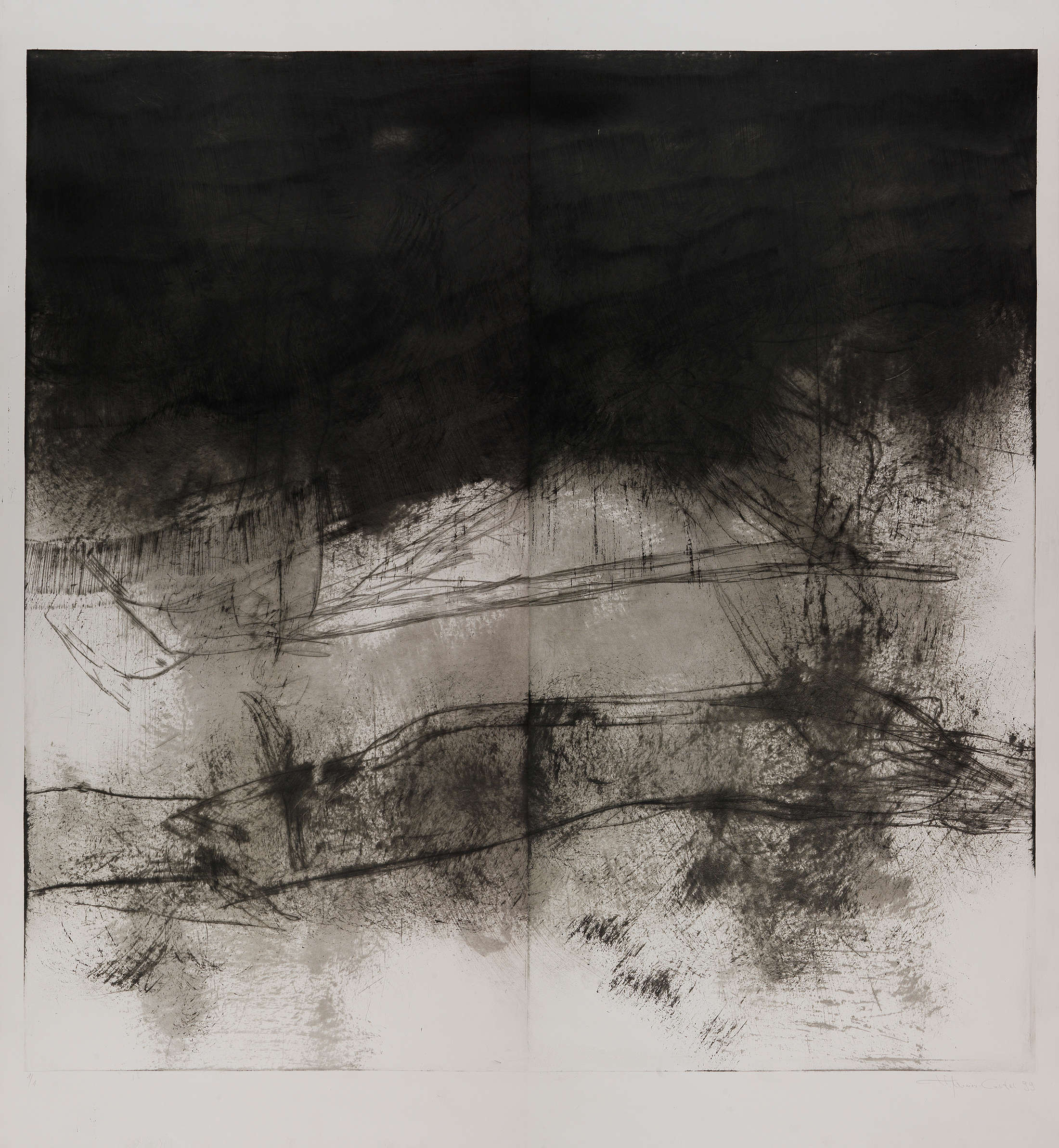 Impact drills or asphalt roads could be tools of printing plate production, in the eyes of Thomas Meier-Castel. Born in Saarland in 1949, deceased in 2008, the artist occupies a position in the history of etching as radical as it is contemporary. He opted to pursue etching at an early age and in concentrating on this one sole medium he steadily expanded its scope, in terms both of format and creative approach. His metal printing plates (of copper, aluminium, iron or zinc) were frequently more than 1 x 2 metres in size, and he was thus obliged to have a made-to-measure printing press built for them. He explored motifs on site, in the open air, on the street. His tools of choice were the etching needle, angle grinder, impact drill or industrial sanding machine. Six, eight or nine prints might be mounted to create a single work.
